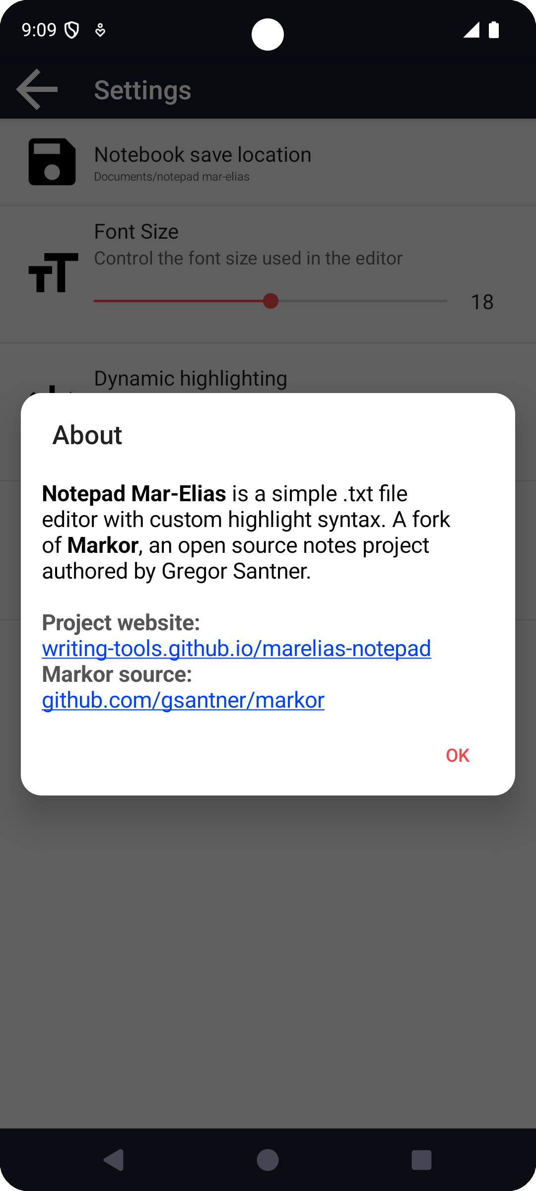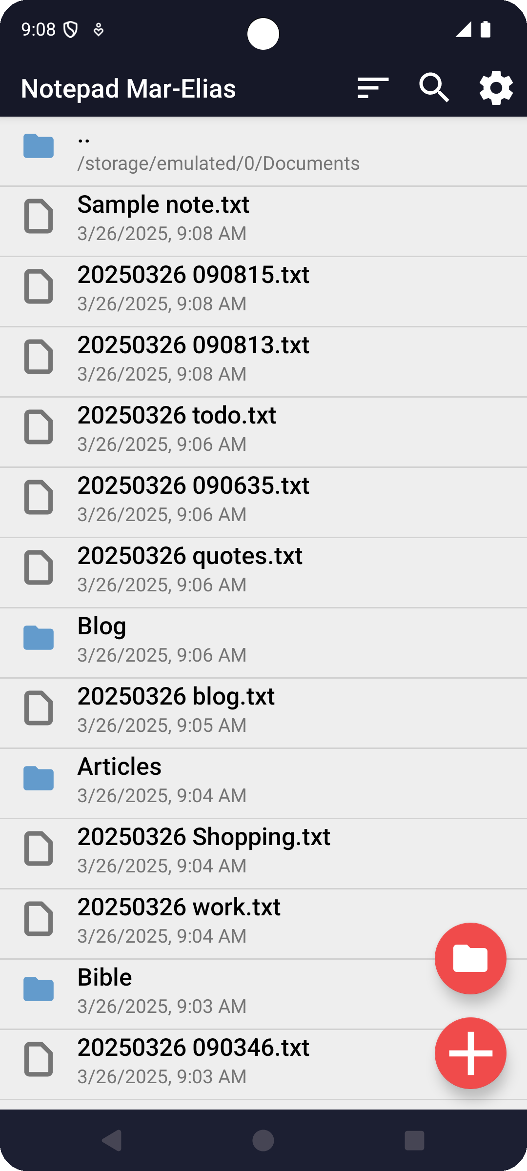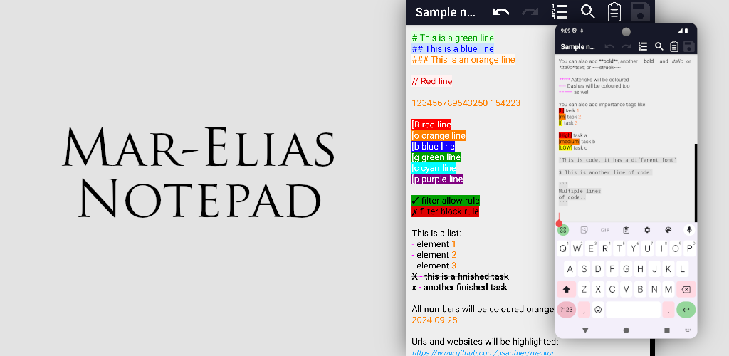 Mar-Elias Notepad is a fork of Markor notes editor (open source project), heavily modified for a much faster and simpler experience. Custom and useful syntax highlights are added. Notes are dated on creation and saved as text files easily syncable with a PC.