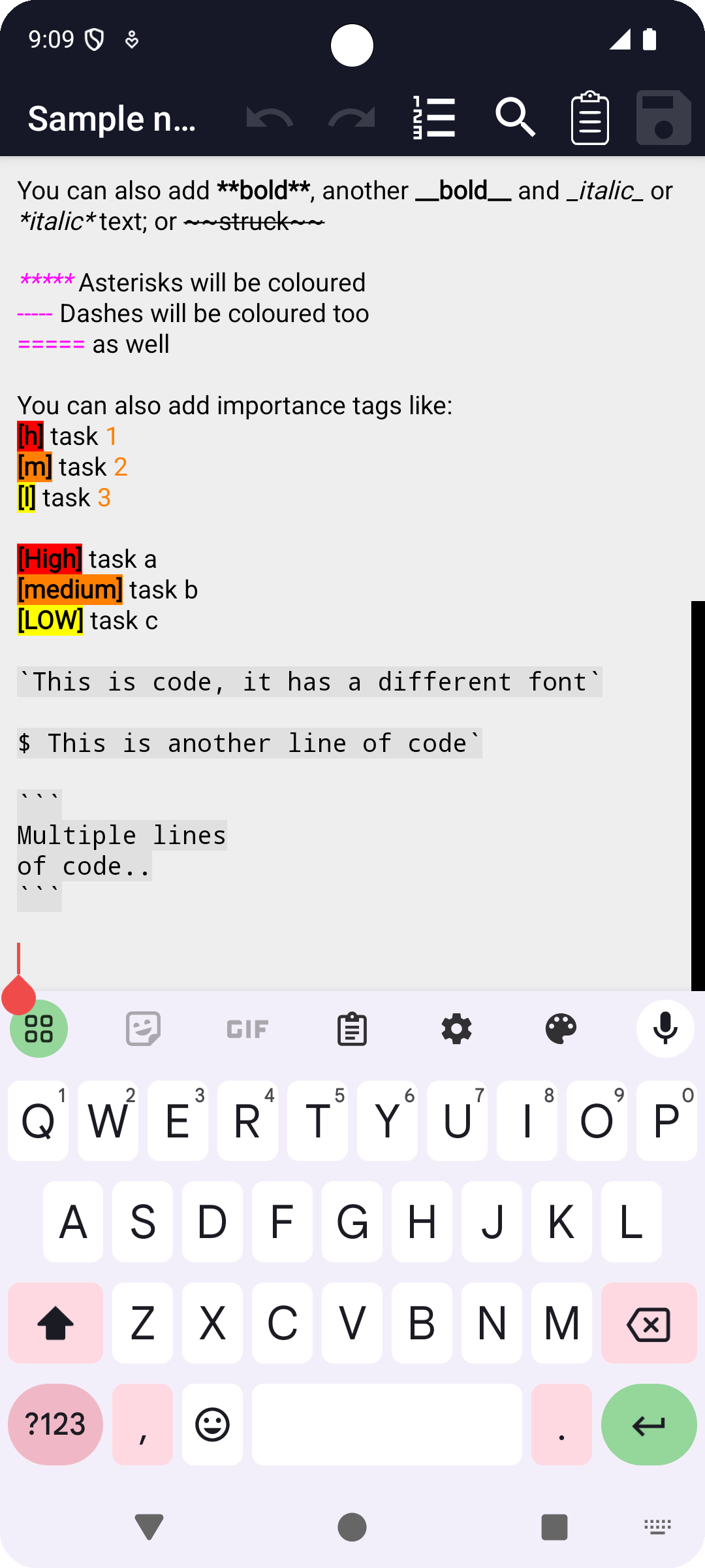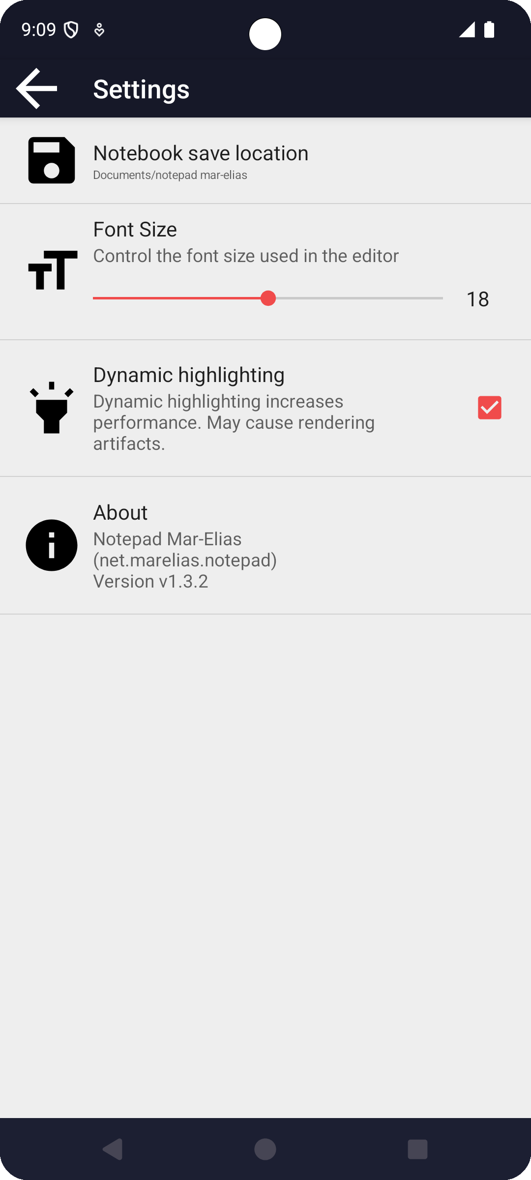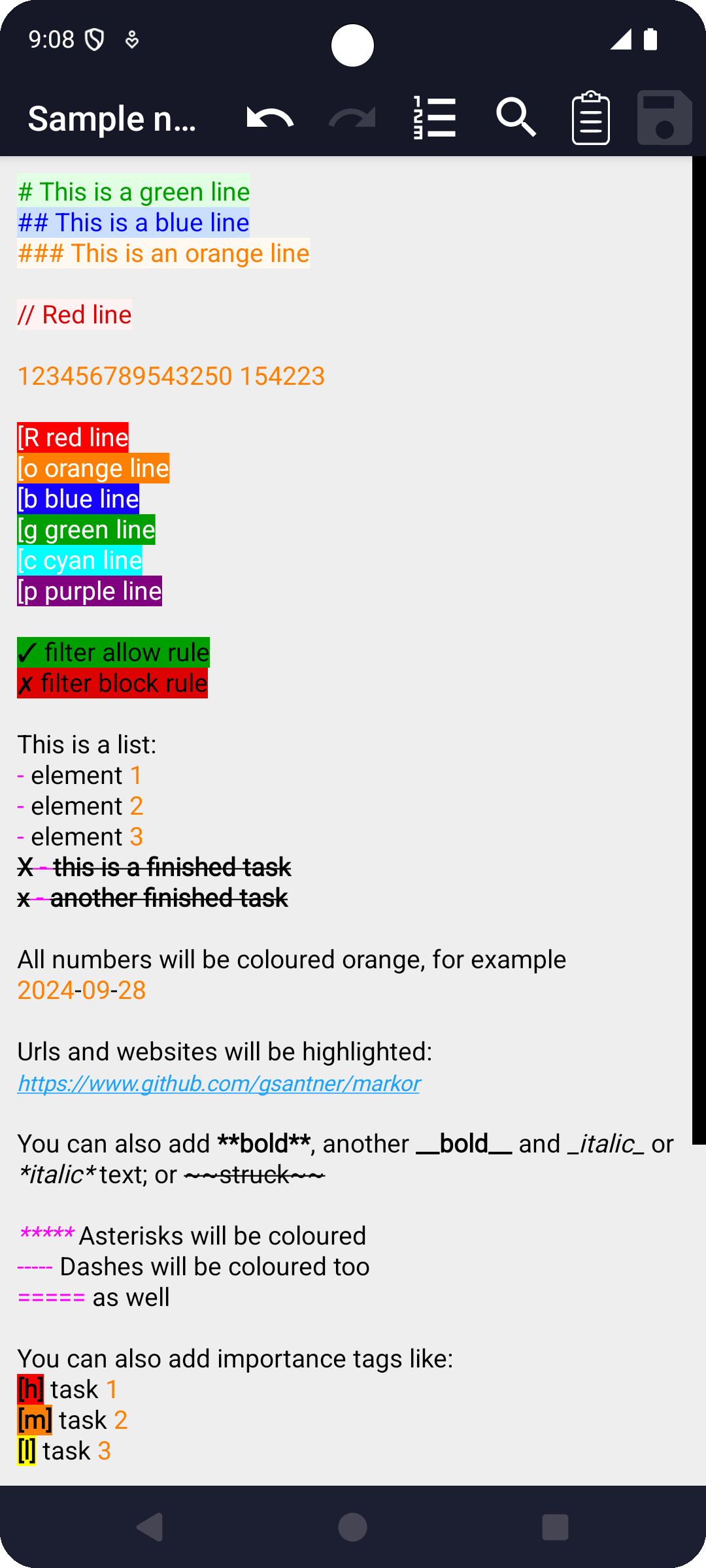Mar-Elias Notepad is a fork of Markor notes editor (open source project), heavily modified for a much faster and simpler experience. Custom and useful syntax highlights are added. Notes are dated on creation and saved as text files easily syncable with a PC.